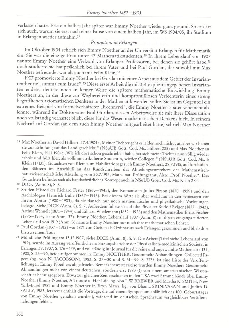 Cordula Tollmien, "Sind wir doch der Meinung, daß ein weiblicher Kopf nur ganz ausnahmsweise in der Mathematik schöpferisch tätig sein kann..." - eine Biographie der Mathematikerin Emmy Noether (1882 - 1935) und zugleich ein Beitrag zur Geschichte der Habilitation von Frauen an der Universität Göttingen, in: Göttinger Jahrbuch 38 (1990), S.153-219.